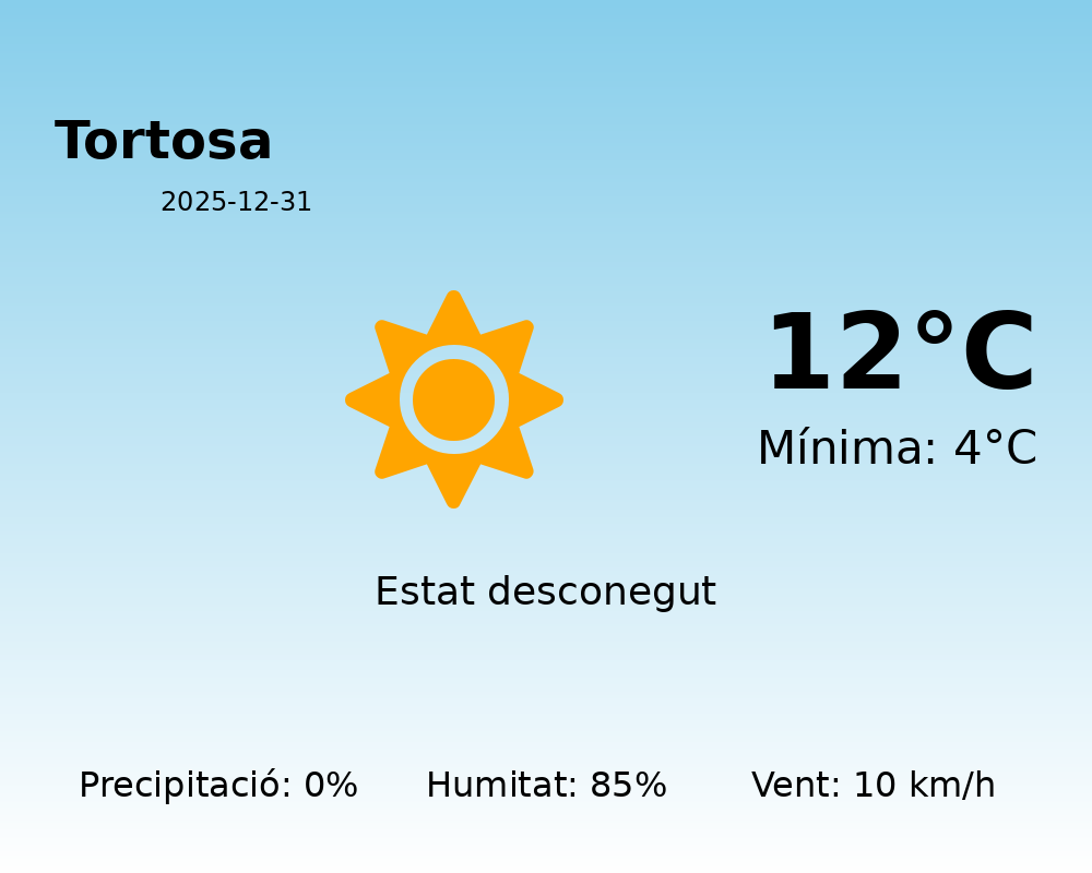En l’últim dia de l’any, Tortosa es presenta amb unes condicions meteorològiques força tranquil·les. Tot i que l’estat exacte del cel no està especificat, es preveu un panorama sense precipitacions, la qual cosa farà que pugueu gaudir de les activitats a l’aire lliure sense preocupacions per la pluja.