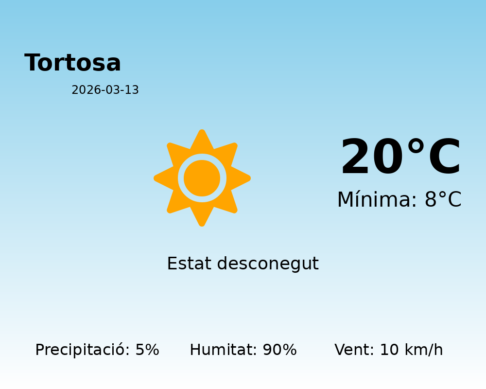 Avui, a Tortosa, esperem una jornada amb temperatures agradables però amb algunes condicions meteorològiques a tenir en compte. La temperatura màxima arribarà als 20 °C mentre que la mínima serà de 8 °C, oferint un rang tèrmic moderat durant el dia.
