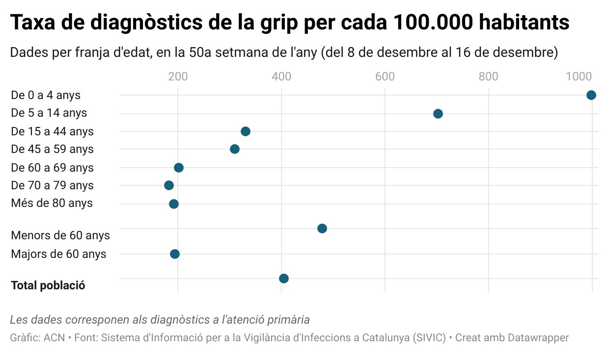 Entre el 8 i el 14 de desembre es van fer 32.920 diagnòstics de grip a l’atenció primària, pels 25.158 de la setmana anterior. Del total, 2.877 són de nens de 0 a 4 anys; 5.534 de nens de 5 a 14 anys; 14.462 són de persones d’entre 15 i 44; 5.943 són del grup de 45 a 59; 1.912 es corresponen al grup de 60 a 69 anys; 1.268 del grup de 70 a 79; i 924 són de majors de 80 anys.