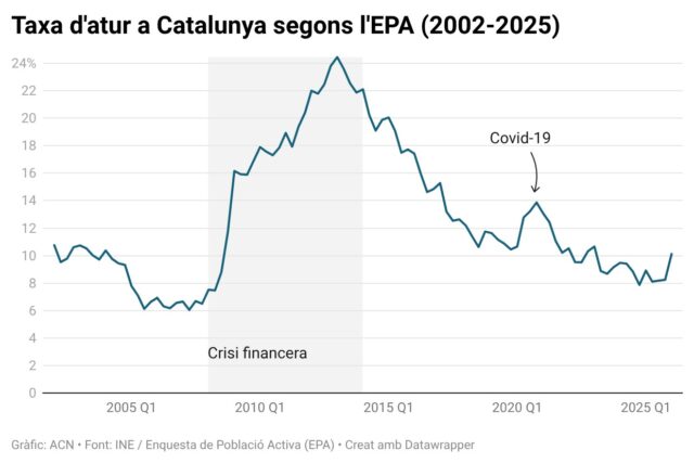 ACN Barcelona – La taxa d’atur ha crescut fins al 10,12% a Catalunya en el primer trimestre de l’any, 1,2 punts més que el mateix període de l’any passat i s’ha tornat a situar en el doble dígit després d’onze trimestre, segons les dades de l’Enquesta de Població Activa (EPA) que ha publicat aquest dimarts l’Institut Nacional d’Estadística (INE). En total, Catalunya ha començat l’any amb 435.600 aturats, un 24% més que el trimestre anterior i un 15,7% més que l’any passat. D’altra banda, l’ocupació s’ha reduït un 1,18% en comparació amb el període entre octubre i desembre, més del doble que l’any anterior (-0,16%) amb 46.200 feines menys.