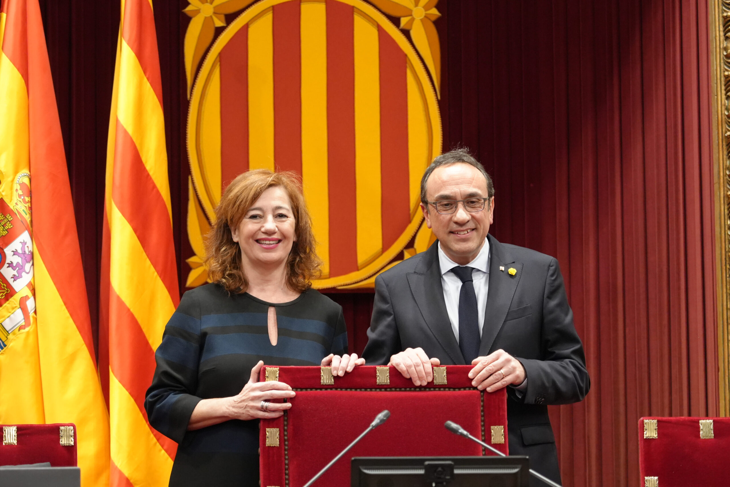 ACN Barcelona – El president del Parlament, Josep Rull, acompanyat de la resta de membres de la Mesa, ha rebut aquest dijous la presidenta del Congrés, Francina Armengol, que ha fet una visita institucional. Rull ha rebut Armengol a la seva arribada i l’ha acompanyat al despatx d’audiències, on la presidenta del Congrés ha saludat la resta de membres de la Mesa: els vicepresidents Raquel Sans i David Pérez i els secretaris Glòria Freixa, Juli Fernàndez, Rosa Maria Ibarra i Judit Alcalá. Armengol ha signat en el llibre d’honor i ha intercanviat obsequis amb Rull. A l’escala d’honor, el conseller de la Presidència en funcions de president, Albert Dalmau, també ha saludat Armengol i Rull durant la visita.